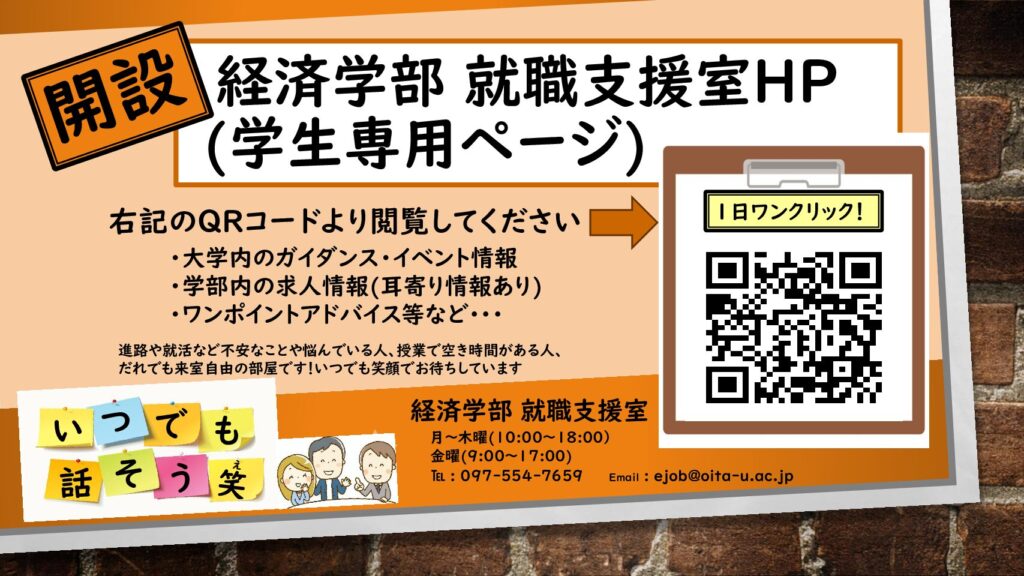 2025年9月22日(月)9:00AMに経済学部就職支援室HP(学生専用ページ)を開設しました。